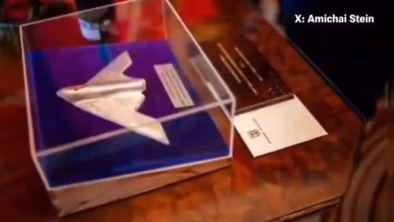 آمیخای استاین، خبرنگار شبکه آی۲۴ در شبکه ایکس نوشت بنیامین نتانیاهو، نخستوزیر اسرائیل، در سفر به آمریکا و دیدار با دونالد ترامپ یک یک مزوزا (قاب دعا) به رییسجمهور ایالات متحده هدیه داده که از ترکش یک موشک ایرانی ساخته شده و به شکل بمبافکن بی-۲ طراحی شده است.
