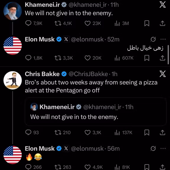 ایلان ماسک در پاسخ به پست انگلیسی علی خامنهای در ایکس به فارسی نوشت: «زهی خیال باطل.» خامنهای در این پست نوشته بود: «ما به دشمن تسلیم نمیشویم.»