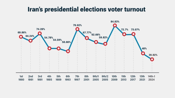 The June 28 presidential election marked the lowest voter turnout in the history of the Islamic Republic, with only 40 percent participation. This breaks the previous record set during the last election, in which the late President Ebrahim Raisi won with 48 percent turnout.