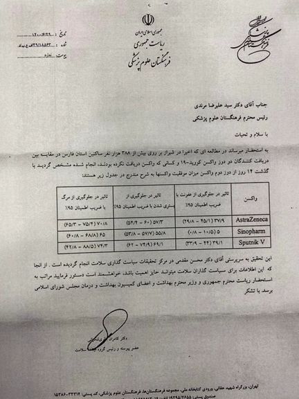 کامران باقری لنکرانی، وزیر اسبق بهداشت و عضو فرهنگستان علوم پزشکی «نامه مرکز تحقیقات سیاستگذاری سلامت» را تایید کرد. در این نامه به استناد تحقیق روی ۳۸۰ هزار نفر در شیراز «میزان تاثیر واکسن سینوفارم در جلوگیری از عفونت» و ابتلا به ویروس کرونا فقط ۵ درصد اعلام شده است.