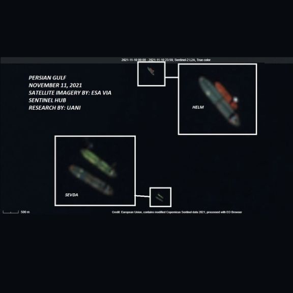 تصاویر ماهوارهای حاکی از آن است که دو نفتکش ایرانی درحال انتقال نفت به صورت«کشتی به کشتی»در خلیج فارس هستند.این دو نفتکش به اسامی هلم و سودا،متعلق به شرکت ملی نفتکش ایران هستند و یکی از این دو نفتکش باارسال پیامهای جعلی وانمود میکند دریکی از پایانههای عراق درحال بارگیری است