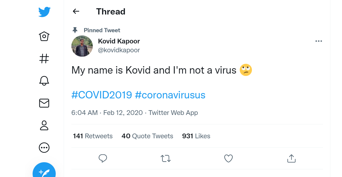 این هم شاید یکی از بدبیاریهای عجیب و غریب باشد که کسی نامش با یک ویروس مرگبار مانند کووید-۱۹ یکی باشد. کووید کاپور یک شهروند هندی از شهر بنگلور است که میگوید از زمان تصمیم سازمان بهداشت جهانی برای نامگذاری ویروس کرونا به کووید-۱۹ زندگیاش طور دیگری شده است. کووید کاپور برای اولین بار در فوریه سال ۲۰۲۰ و بلافاصله پس ازاینکه سازمان بهداشت جهانی ویروس کرونا را کووید-۱۹ نامید، در توییتی نوشت: «کووید کاپور هستم و من یک ویروس نیستم.»