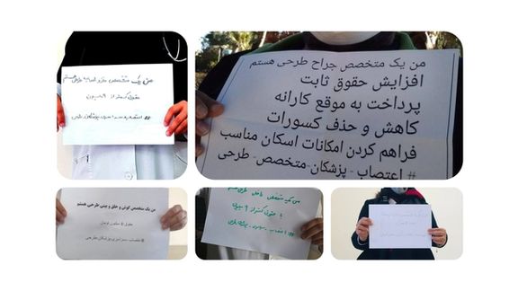 در تصاویری که این پزشکان طرحی منتشر کردهاند پلاکاردهایی در دست دارند که از جمله بر روی آنها میزان اولیه دستمزد ماهانه و مبلغ کارانه به همراه پرداخت نهایی به آنان درج شده است.
