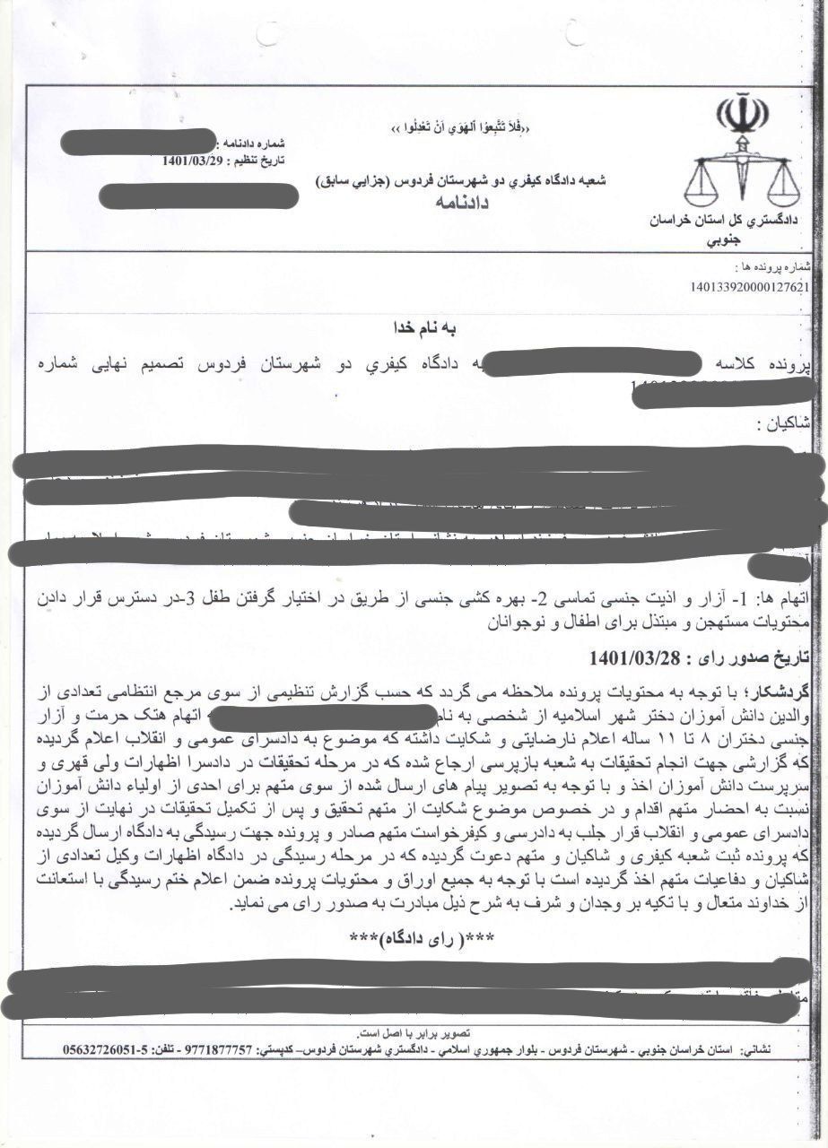 نسخهای از حکم دادگاه که به دست ایران اینترنشنال رسیده که نشان میدهد هفت نفر از این معلم شکایت کردهاند و او به «آزار و اذیت جنسی تماسی»، «بهرهکشی جنسی از طریق در اختیار گرفتن طفل» و «در دسترس قرار دادن محتوای مستهجن و مبتذل برای اطفال و نوجوانان» متهم شده است.