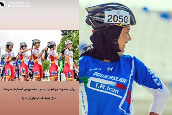 رویا صفوی ملی پوش پیشین اسکیت سرعت ایران در حمایت از #اعتراضات_مردمی و #مهسا_امینی با انتشار عکسی از پوشش اسکیتبازان در جهان نوشت:«برای حسرت پوشیدن لباس مخصوص اسکیت سرعت، مثل بقیه اسکیتبازان دنیا»