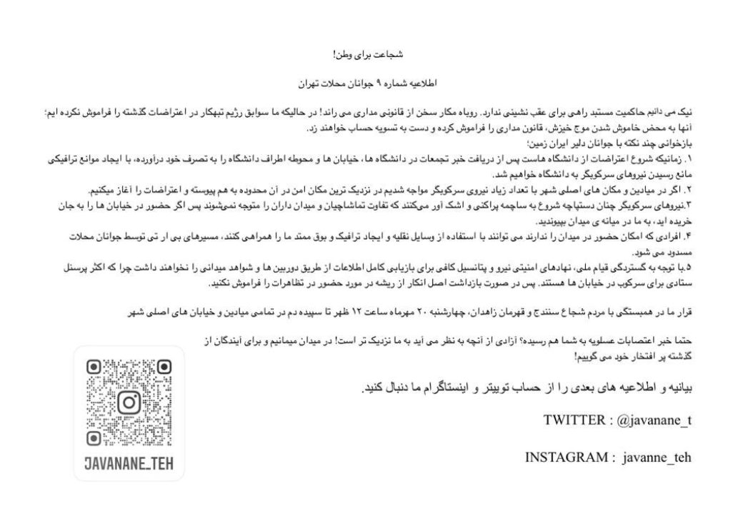 گروه «جوانان محلات تهران» در اطلاعیه شماره ۹ خود فراخوانی را برای تجمع در روز چهارشنبه ۲۰ مهر ماه «از ساعت ۱۲ظهر تا سپیدهدم در تمامی میادین و خیابانهای اصلی» صادر کرد.