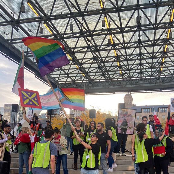 کنشگران کانادا در تظاهرات تورنتو با حمل درفش کاویان، شعار «کوییر، ترنس، آزادی» سردادند