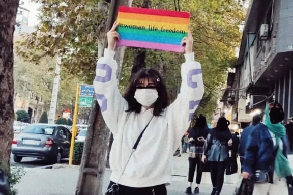 عکسی که در فضای مجازی منتشر شده، یک معترض را نشان میدهد که بدون حجاب اجباری یک پرچم رنگینکمانی جنبش کوییر را در خیابان حمل میکند که بر روی آن نوشته شده «زن زندگی، آزادی»