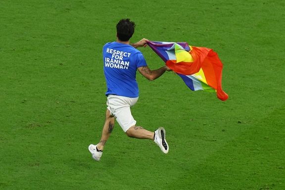 معترض با لباسی که روی آن نوشته شده بود «احترام برای زن ایرانی» و «اوکراین را نجات دهید» و پرچم رنگینکمانی در دست، به وسط زمین بازی اروگوئه و پرتغال در جام جهانی، که توسط علیرضا فغانی داوری میشد، دوید
