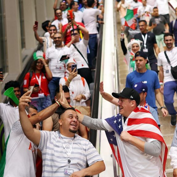 تصویری از دست دوستی هوادار ایرانی و آمریکایی فوتبال، پیش از دیدار تیمهای ملی فوتبال ایران و آمریکا در جام جهانی قطر ۲۰۲۲