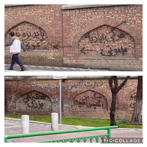 تصاویر رسیده به ایران اینترنشنال نشان میدهد حامیان جمهوری اسلامی روی دیوارهای باغ سفارت بریتانیا در خیابان شریعتی تهران شعارنویسی کردهاند.