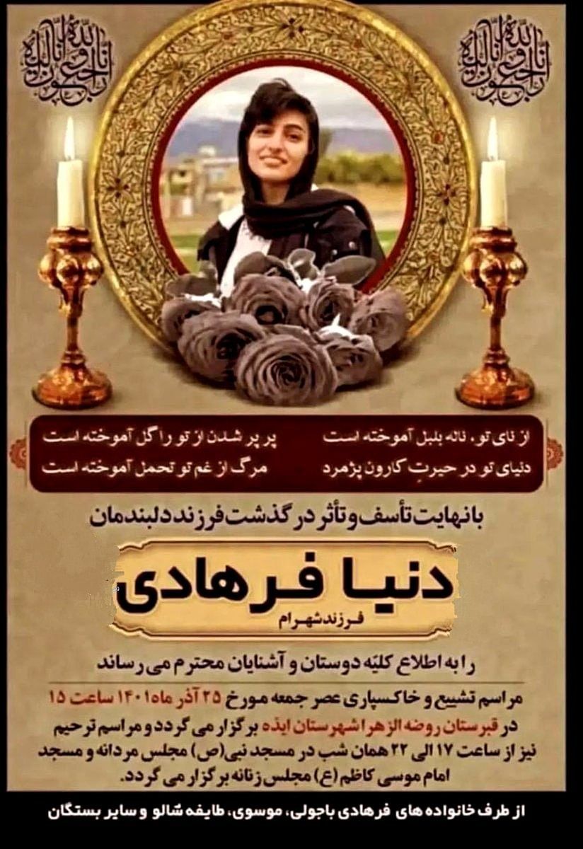 مراسم تدفین دنیا (سونیا) فرهادی در تاریخ ۲۵ آذر ماه با حضور جمعیت زیادی از مردم ایذه، در این شهر برگزار شد. او دانشجوی ۲۱ ساله رشته معماری در اهواز بود که از روز ۱۶ آذر و همزمان با اعتراضات دانشجویی این شهر ناپدید شده بود.
