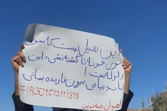 تصویر منتشرشده در رسانههای اجتماعی نشان میدهد یکی از شهروندان در زاهدان در اعتراضات روز جمعه پلاکاردی را به دست گرفته که با اشاره به هشتگ «سپاه تروریست»، درباره اعتراضات نوشته است: «این سیل نیست که بمونی توی خونه تا کشته نشی، این زلزلهست! باید بیایی بیرون تا زنده بمونی.»