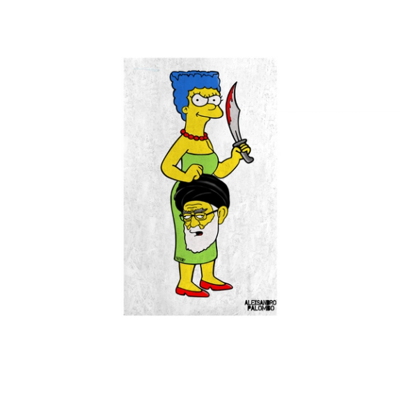 الکساندرو پالمبو هنرمند ایتالیایی بار دیگر «مارج سیمپسون» شخصیت پرطرفدار کارتونی را با نمادی اعتراضی به حکومت ایران مقابل سرکنسولگری جمهوری اسلامی در شهر میلان به تصویر کشید. در نقاشی جدید این شخصیت با ساطوری در یک دست و سر علی خامنهای در دست دیگر دیده میشود