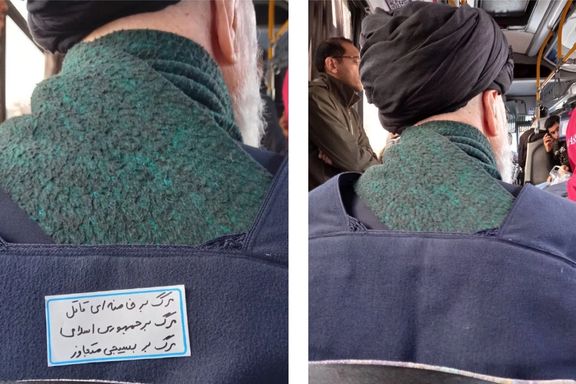تصویری که یک شهروند از مشهد به ایران اینترنشنال فرستاده نشان میدهد او برچسبهایی را با شعارهای علیه حکومت آماده کرده و یکی از آنها را روی کولهپشتی یک آخوند در اتوبوس نصب کرده است.