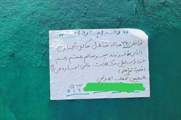 تصویر ارسالی شهروندان به ایران اینترنشنال، تکه کاغذی را نشان میدهد که یک زن در خیابانهای منطقه غرب تهران روی دیوار معابر عمومی نصب کرده و در آن نوشته که رحم خود را به دلیل مشکلات مالی برای کسب درآمد اجاره میدهد. این زن نوشته که دارای خانواده و بچه است.