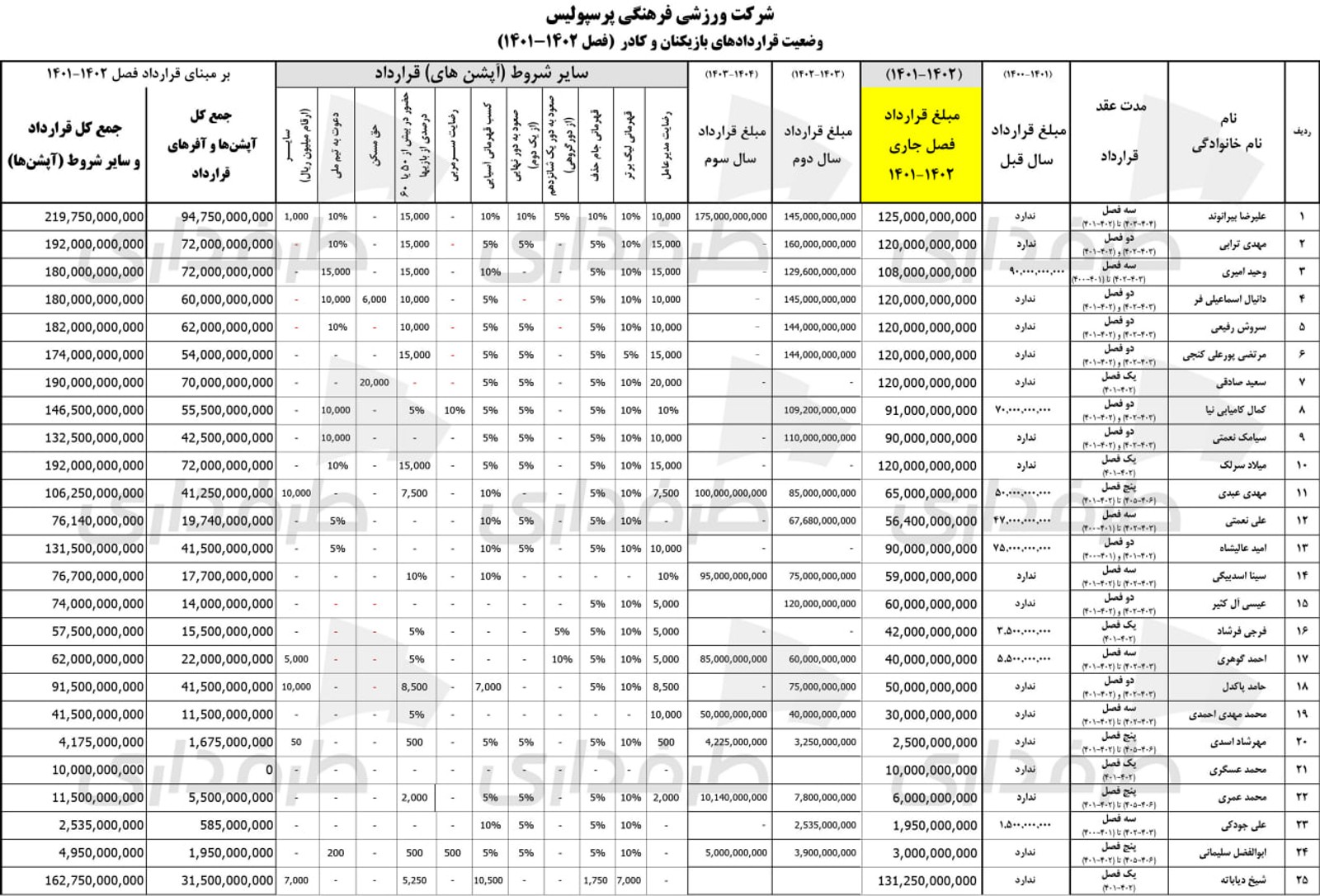 در فصل ۱۴۰۱-۱۴۰۲ فوتبال ایران، متوسط قرارداد پایه بازیکنان پرسپولیس، ۱۲ میلیارد بوده است. مهدی ترابی، دانیال اسماعیلی فر، سروش رفیعی، مرتضی پورعلی گنجی، سعید صادقی، میلاد سرلک و... ۱۲ میلیارد تومان قرارداد بسته بودند اما آپشن ها متغیر بود؛ به عنوان مثال دریافتی سعید صادقی و مهدی ترابی با آپشن از ۱۹ میلیارد عبور کرده است، اما دریافتی دانیال اسماعیلی فر و سروش رفیعی روی ۱۸ میلیارد می ماندند.