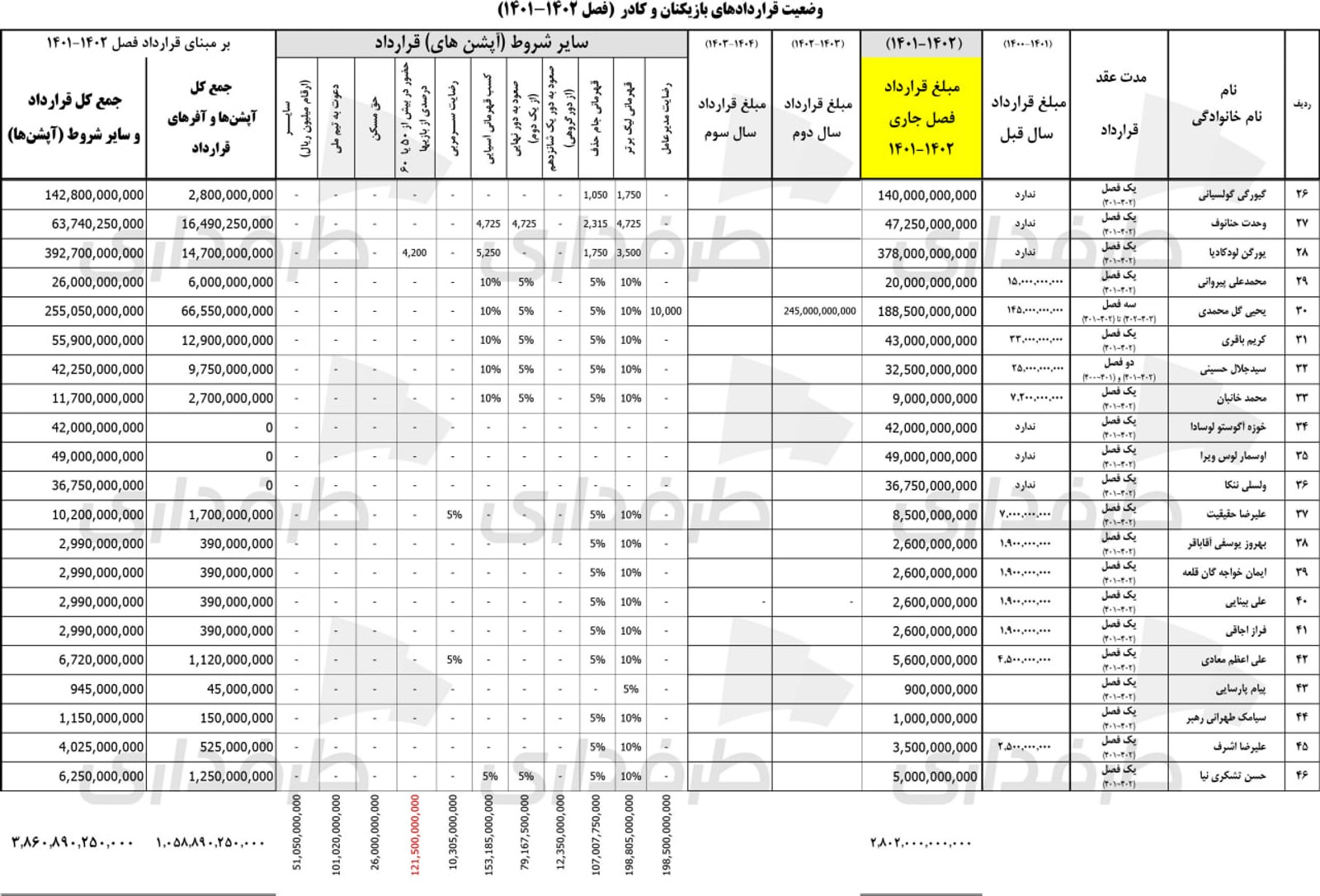 مطابق این جدول، قرارداد پایه گولسیانی از بقیه بازیکنان بالاتر بوده است؛ حدود ۱۴ میلیارد. اما پرسپولیسی ها برای او آپشن خاصی در نظر نگرفته‌اند.