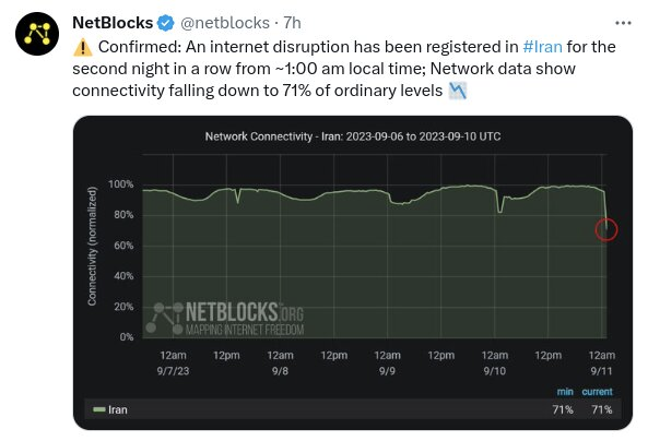 شرکت «نتبلاکس» (NetBlocks) که وضعیت دسترسی به اینترنت را در کشورهای جهان پایش میکند، از بروز اختلال در اینترنت ایران در شبهای ۱۸ و ۱۹ شهریور خبر داد. هر دوی این اختلالات، حوالی ساعت یک بامداد به وقت ایران ایجاد شدهاند.