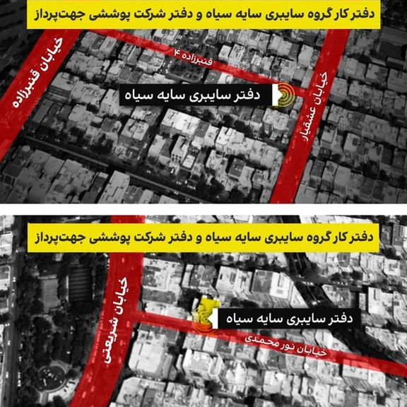 دفاتر عملیاتی گروه سایبری سایه سیاه در دو نقطه تهران قرار دارند: یکی پلاک ۲۳ خیابان نورمحمدی در خیابان شریعتی و دیگری پلاک چهار کوچه قنبرزاده چهار در خیابان عشقیار واقع در بزرگراه سلیمانی.