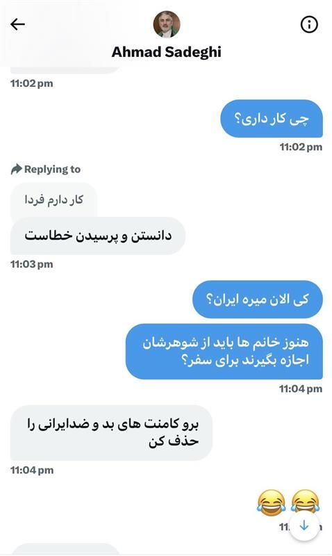 بنابر گفته این کاربر ایرانی-استرالیایی شبکه ایکس، حساب منتسب به احمد صادقی، سفیر جمهوری اسلامی در استرالیا، روز یکشنبه پانزدهم بهمن ماه، با ارسال پیام خصوصی به این کاربر گفته که او باید «کامنتهای بد» خود را پاک کند.
