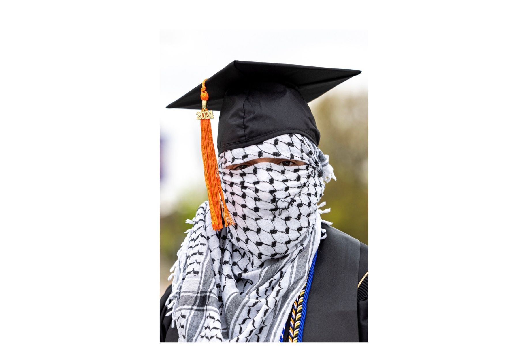 خبرگزاری رویترز تصویری از یک دانشجوی فلسطینی معترض در آمریکا منتشر کرده که به همراه کلاه و لباس فارغالتحصیلی در مراسم پایان تحصیلش در دانشگاه شهر دنور، چفیه روی سر و صورتش کشیده است. رویترز نوشته او قصد دارد پس از فارغالتحصیلی به کشورش بازگردد.