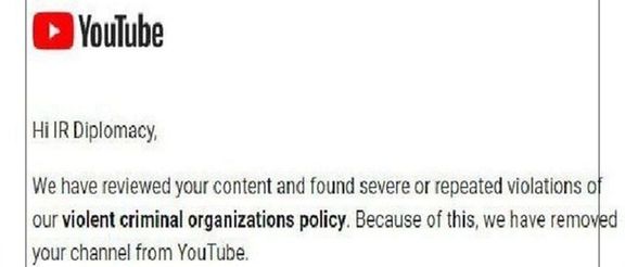 ایرنا، خبرگزاری دولت ایران، روز سهشنبه هشتم خرداد گزارش داد یوتیوب در پیامی خطاب به حساب وزارت امور خارجه جمهوری اسلامی، دلیل این اقدام را «نقض شدید یا مکرر» مقررات این رسانه در خصوص «سازمانهای خشن جنایتکار» عنوان کرده است.