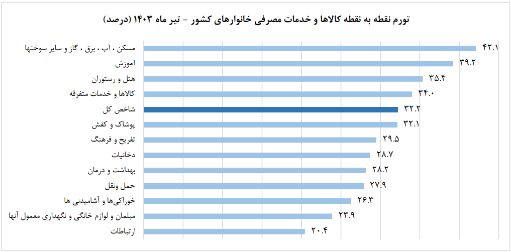 بالاترین میزان تورم به ترتیب در گروههای: هتل و رستوران۴۹/۷ درصد، پوشاک و کفش۴۱/۵ درصد و مسکن، آب، برق، گاز و سایر سوختها ۴۰/۳ درصد ثبت شده است.