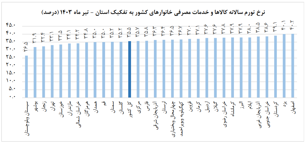 استانهای اصفهان با ۴۰/۲ درصد، یزد با ۴۰/۱ درصد و کردستان با ۳۹/۱ درصد بالاترین نرخ تورم سالانه را به خود اختصاص دادند. از طرف دیگر، استانها سیستان و بلوچستان با ۲۶/۵ درصد، بوشهر با ۳۱/۹ درصد و زنجان با ۳۲/۴ درصد، کمترین نرخ تورم سالانه را داشتند.