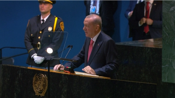 رجب طیب اردوغان، رییس جمهور ترکیه در صحبتهایش در سازمان ملل، با اشاره به اینکه ارزشهای جهان غرب در غزه نابود میشوند گفت «دولت اسرائیل حقوق اساسی بشر را نادیده میگیرد.»