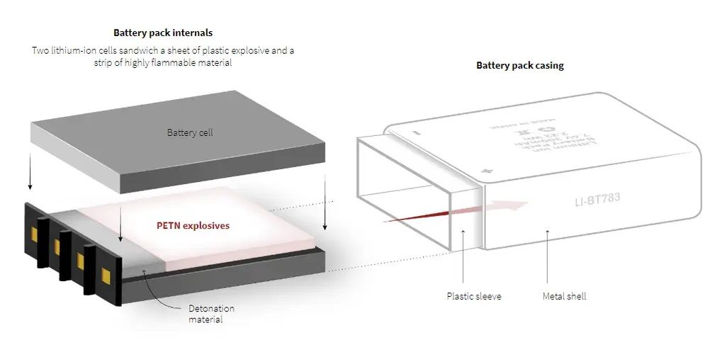 به گفته این منبع لبنانی و عکسهایی که خبرنگاران رویترز مشاهده و بررسی کردهاند، یک ورق نازک مربع شکل با شش گرم مواد منفجره پلاستیکی سفید پنتاریتوریتول تترا نیترات (PETN) بهشکل فشرده بین دو سلول باتری مستطیل شکل گذاشته شده بود.