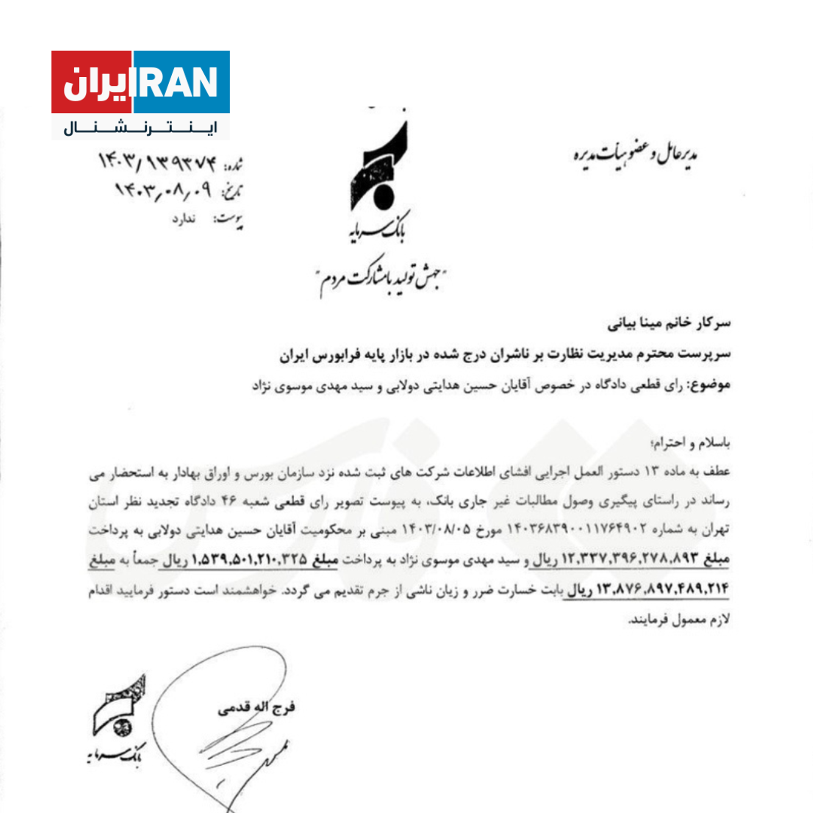 بانک سرمایه با انتشار سندی از محکومیت هزار و ۲۰۰ میلیارد تومانی حسین هدایتی و پرداخت این مبلغ به عنوان ضرر و زیادی به این بانک خبر داد. مطابق این سند منتشر شده در سامانه کدال، حسین هدایتی باید ۱۲۳۳ میلیارد تومان و مهدی موسوینژاد باید ۱۵۴ میلیارد تومتان به بانک سرمایه برگردانند.