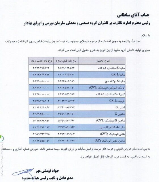 خبرگزاری ایسنا روز دوشنبه ۲۸ آبان تصویر اطلاعیههای جدید علیمردان عظیمی، مدیرعامل گروه خودروسازی ایرانخودرو و جواد توسلیمهر، مدیرعامل گروه خودروسازی سایپا را منتشر کرد که شامل فهرست قیمتهای جدید محصولات این شرکتهاست.