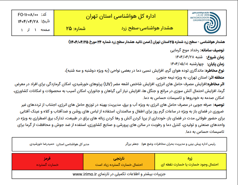 اداره هواشناسی استان تهران در اطلاعیه شماره ۲۵ خود، برای روزهای ۲۸ تیر تا اول مرداد در این استان هشداری در سطح زرد اعلام کرد.