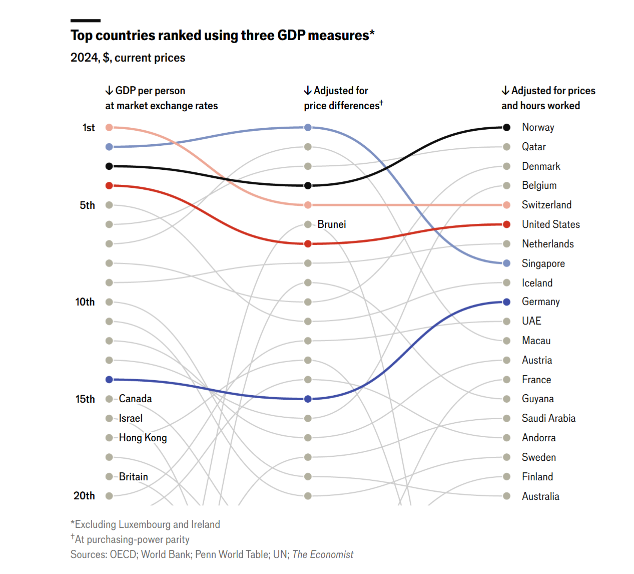 اکونومیست در این ارزیابی از سه معیار کلیدی استفاده کرده است: تولید ناخالص داخلی (جیدیپی)، سرانه بر پایه نرخ ارز رسمی، جیدیپی سرانه تعدیلشده بر اساس برابری قدرت خرید (پیپیپی)، و در نهایت شاخصی ترکیبی که افزون بر قیمتها، ساعات کار را نیز در نظر میگیرد.
