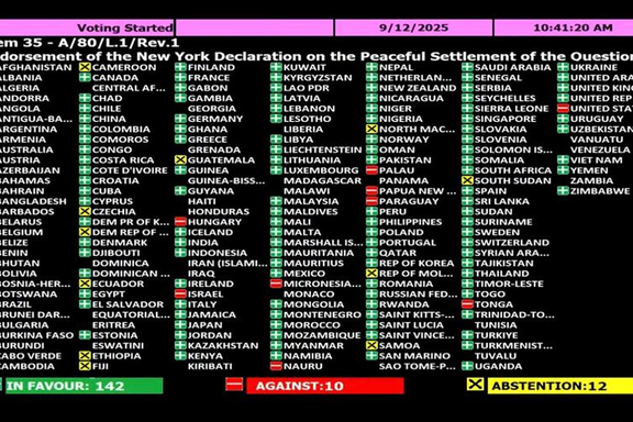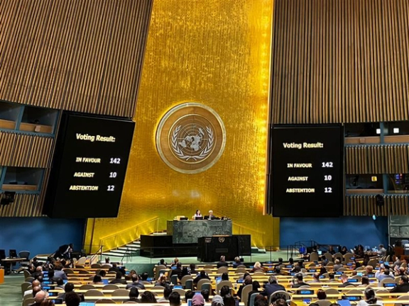 مجمع عمومی سازمان ملل متحد روز جمعه با ۱۴۲ رای موافق، ۱۰ رای مخالف و ۱۲ رای ممتنع قطعنامهای را تصویب کرد که بر حمایت از راهحل دوکشوری تاکید دارد. این قطعنامه به ابتکار فرانسه و عربستان سعودی ارائه شده بود.