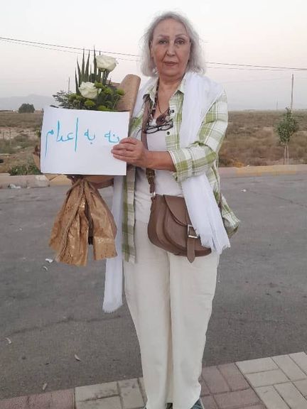 تصویر منتشر شده در شبکههای اجتماعی نشان میدهد نسرین جوادی، زندانی سیاسی ۶۸ ساله و از اعضای اتحادیه آزاد کارگران ایران پس از سه سال و چهار ماه حبس و آزادی از زندان قرچک ورامین، پلاکاردی را با شعار «نه به اعدام» در دست گرفته است.