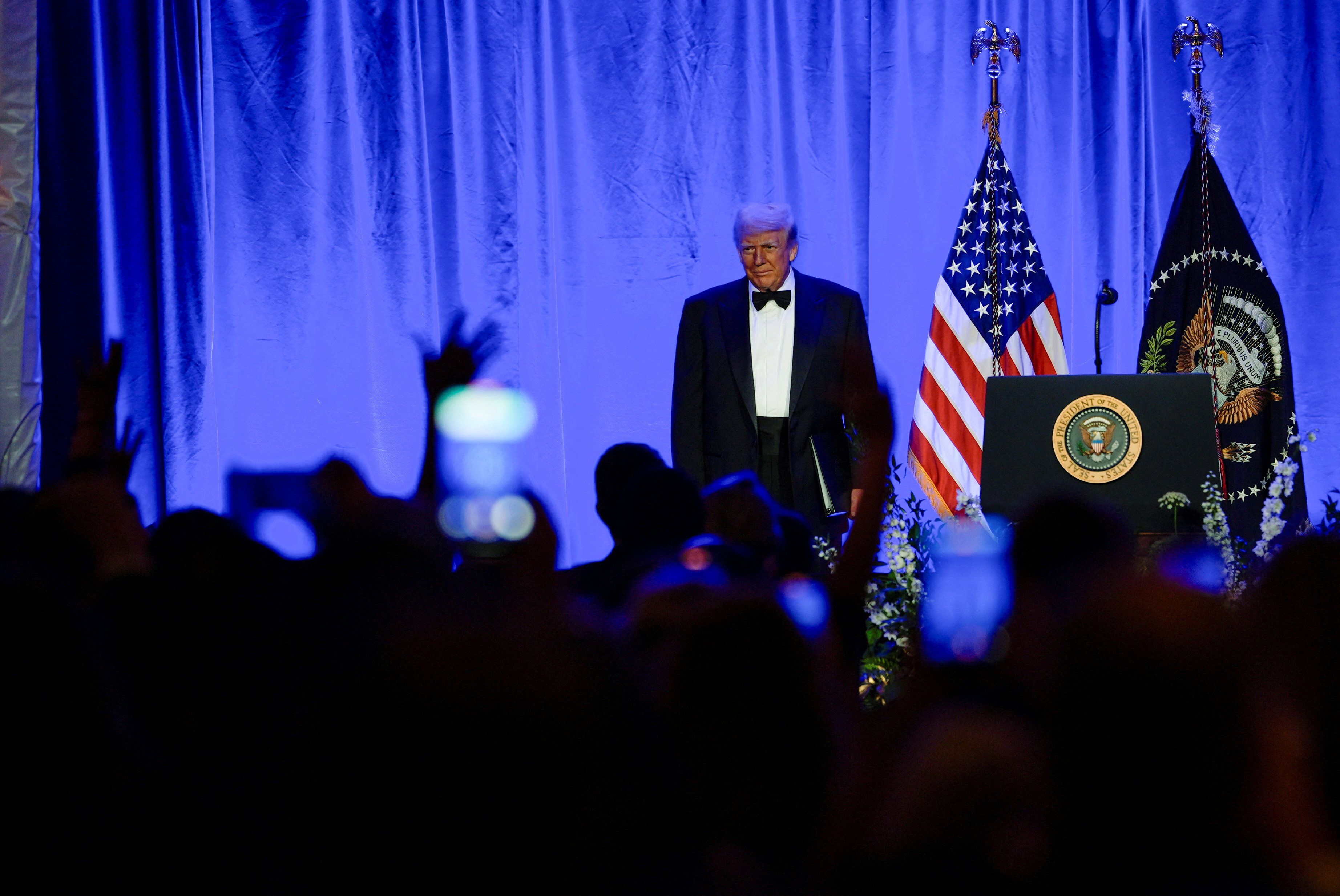 دونالد ترامپ، رییسجمهوری ایالات متحده که هنگام ترک کاخ سفید به مقصد ورزشگاه اِستِیتفارم یکشنبه را «روزی بسیار سخت» خوانده بود، با تشویق جمعیت درحالی که نام ایالات متحده را فریاد میزدند، وارد مراسم شد.