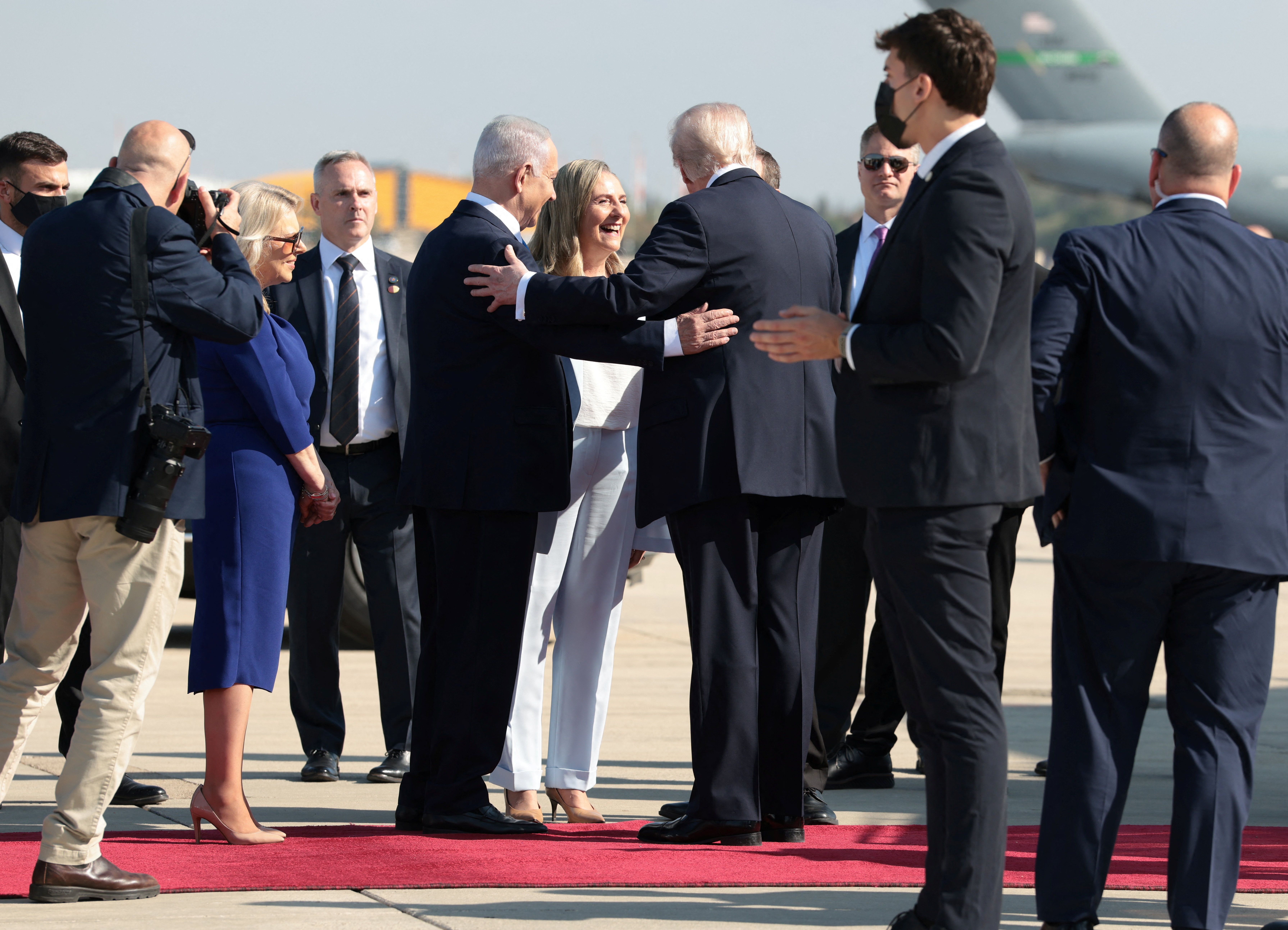 دونالد ترامپ، رییس‌جمهور آمریکا، در فرودگاه تل‌آویو مورد استقبال بنیامین نتانیاهو، نخست‌وزیر، و اسحاق هرتزوگ، رییس‌جمهور این کشور، قرار گرفت. هواپیمای ترامپ پیش از فرود در فرودگاه بن‌گوریون بر فراز میدان گروگان‌های تل‌آویو که محل تجمع اسرائیلی‌ها است پرواز کرد.