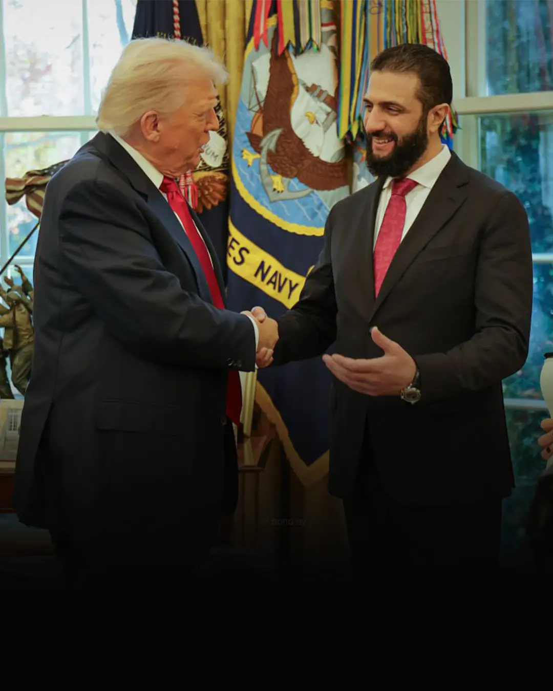 همچنین برخلاف مراسمهای معمول برای رهبران خارجی، الشرع از ورودی فرعی کاخ سفید وارد شد و از مقابل دوربین خبرنگاران عبور نکرد.