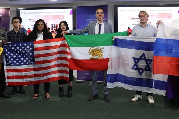 علی رمضانی، دانشجوی زندانی سابق، کسب طلای المپیاد را با پرچم شیر و خورشید جشن گرفت