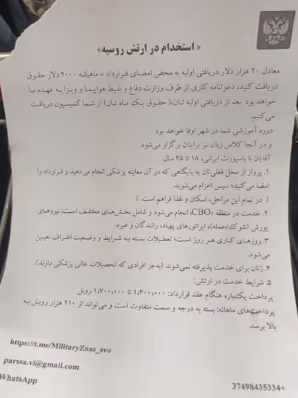 سفارت روسیه در تهران انتشار شبنامهای که مردان ایرانی را به پیوستن به ارتش روسیه با وعده حقوق دلاری دعوت میکرد، «کلاهبرداری» خواند و تکذیب کرد. این واکنش در پی انتشار «شبنامهای» بود که تصاویر آن نیز در رسانههای اجتماعی منتشر شده است.
