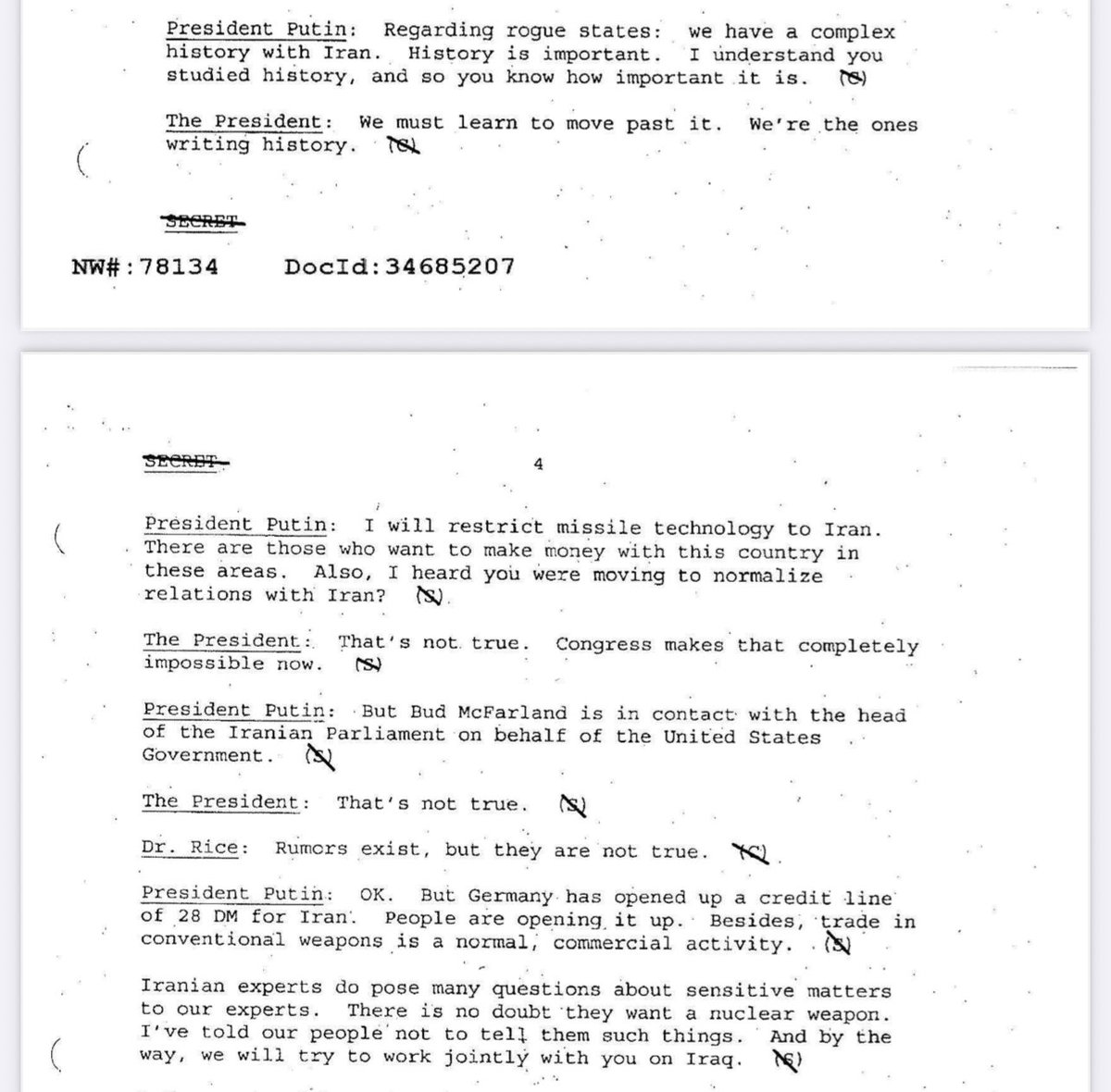 اسناد تازه منتشرشده از آرشیو امنیت ملی آمریکا نشان میدهد ولادیمیر پوتین، رییسجمهوری روسیه، در گفتوگویی محرمانه با جورج دبلیو بوش در سال ۲۰۰۱ بهصراحت گفته است «هیچ تردیدی وجود ندارد که ایرانیها خواهان دستیابی به سلاح هستهای هستند.»