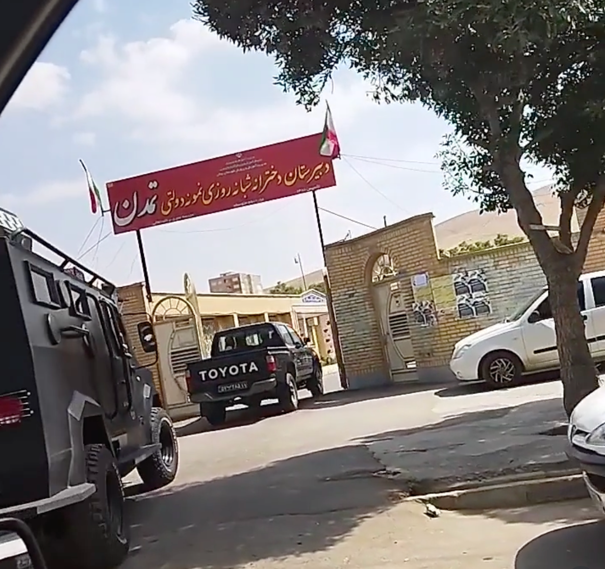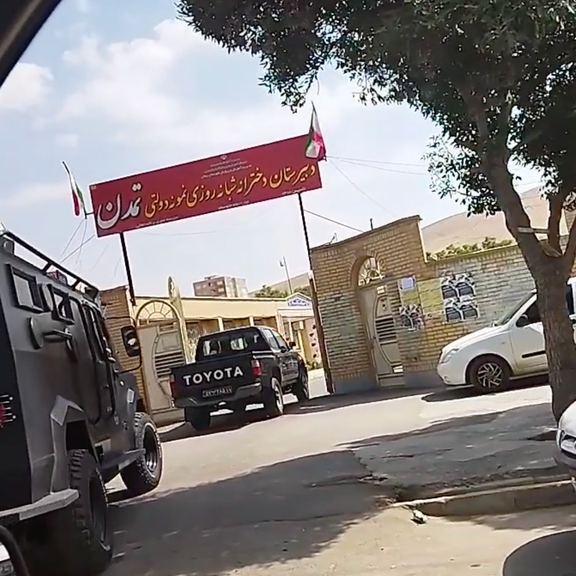 در این تصویر دهها نیروی یگان موتوری و چندین خودروی ویژه سرکوب دیده میشوند که در حیات این دبیرستان مستقر شدهاند.