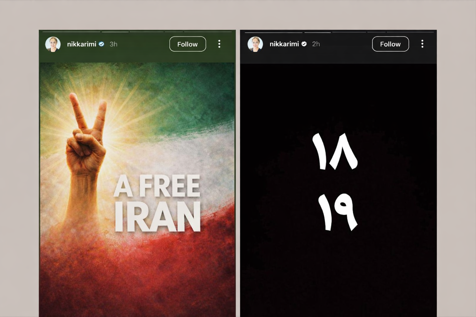 به عنوان نمونه، نیکی کریمی، بازیگر شناختهشده سینمای ایران، با انتشار دو استوری در صفحه شخصی خود در اینستاگرام، خواستار آزادی ایران شد و با نوشتن اعداد ۱۸ و ۱۹، بهصورت تلویحی از فراخوان برگزاری تجمعات اعتراضی علیه جمهوری اسلامی حمایت کرد.