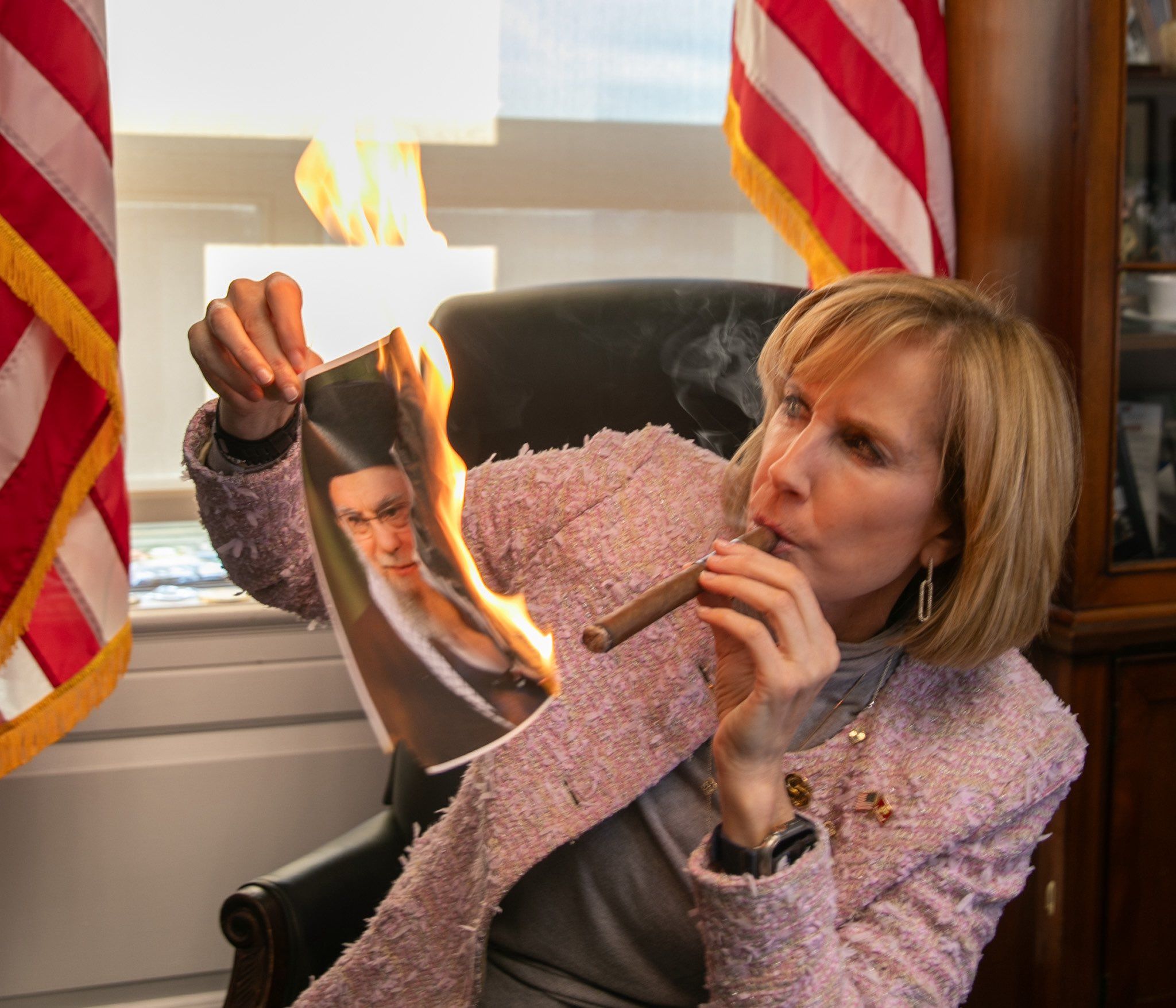 کلودیا تنی، قانونگذار آمریکایی، با آتش زدن عکس خامنهای سیگارش را روشن کرد