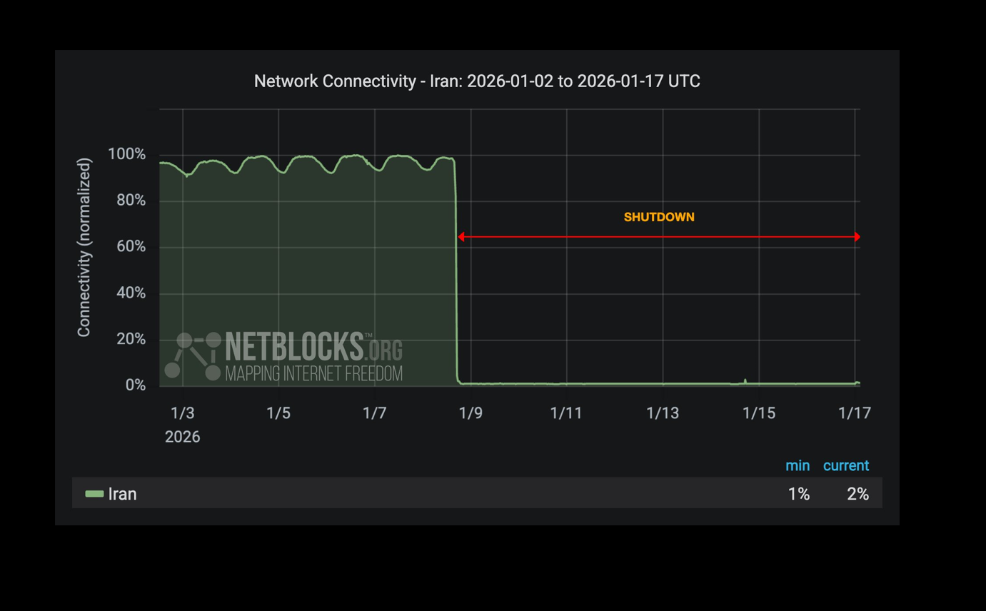 نت بلاکس گزارش داد شاخص‌ها نشان می‌دهد پس از بیش از ۲۰۰ ساعت، بامداد شنبه افزایش بسیار جزئی در اتصال اینترنت در ایران ثبت شده است. با این حال، سطح کلی اتصال همچنان حدود ۲ درصد از میزان معمول است و نشانه‌ای از بازگشت قابل توجه اینترنت مشاهده نمی‌شود.