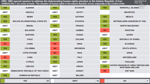 شورای حقوق بشر سازمان ملل متحد در جریان نشست ویژه خود، با تصویب قطعنامهای که از سوی بیش از ۲۰ کشور ارائه شده بود، وضعیت حقوق بشر در جمهوری اسلامی را «بهشدت نگرانکننده» خواند و سرکوب خشونتآمیز اعتراضات سراسری اخیر را قاطعانه محکوم کرد.