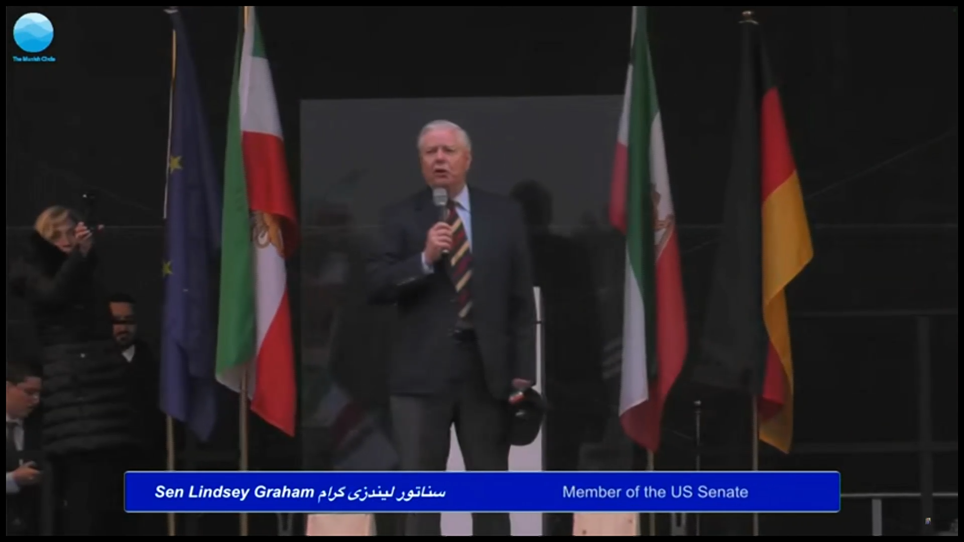 لیندسی گراهام، سناتور آمریکایی، در تجمع ایرانیان در مونیخ گفت: «مردم ایران در حال تاریخسازی هستند و این باشکوهترین لحظه تاریخ ایران است.» او تاکید کرد که به مردم ایران کمک خواهد کرد تا از «شر جمهوری اسلامی» خلاص شوند.