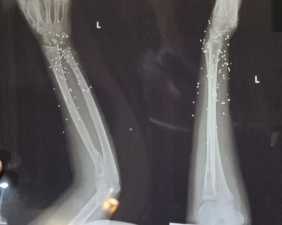در یکی از تصاویر، نزدیک به ۲۰۰ ساچمه در ران و لگن یک زن میانسال دیده شده است.